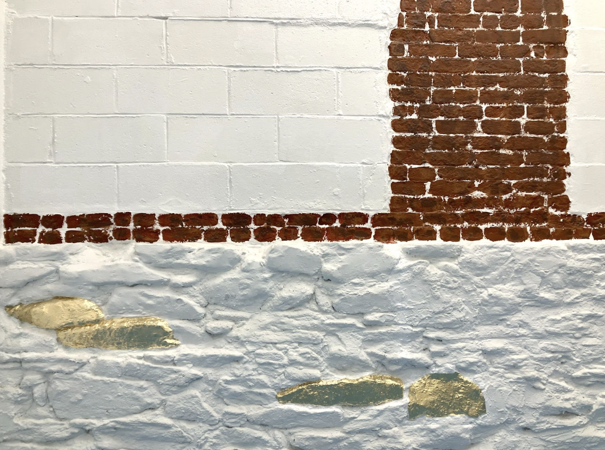 Covering two walls of the Skirt with mirror, Klepikov invites the viewer to look beyond the literal walls of the space into the past, as well as into parallel realities. The original arched brick windows on one of the walls have been filled in with cinderblock as the building shifted from manufacturing to its current artistic production. Klepikov rearticulates these bricks with rolled-on paint, resurrecting the red brick beneath the layers of white paint, a process similar to a tombstone rubbing. Adding a reflection of this wall, she doubles the painted brick arches into a kind of arcade that frames the vestibule of the Skirt. The mirror not only expands the space but creates a new space, a corridor to a world gone by.
